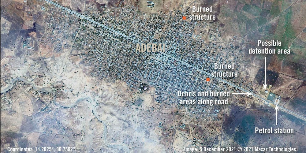 Amnesty International verifizierte zudem Satellitenaufnahmen. Auf den Bildern, die zwischen dem 19. November und dem 5. Dezember erstellt wurden, sind Fahrzeugbewegungen, Menschengruppen um ein behelfsmässiges Gefangenenlager, grosse Mengen an Schutt auf der Hauptstrasse sowie ausgebrannte Gebäude in Adebai zu sehen.