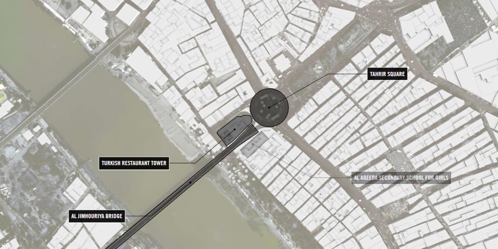 Auf ihrer interaktiven Website Smokescreen – Iraq’s use of military-grade tear gas grenades to kill protesters zeigen die beiden Organisationen eine 3D-Rekonstruktion von Tötungen bei den Protesten am Tahrir-Platz und der Jimhouriya-Brücke in Bagdad. In dieser Gegend wurden seit Oktober 2019 mindestens zwei Dutzend Protestierende durch diese markanten Granaten getötet. Die Rekonstruktion basiert auf Videomaterial, das vor Ort aufgenommen wurde.