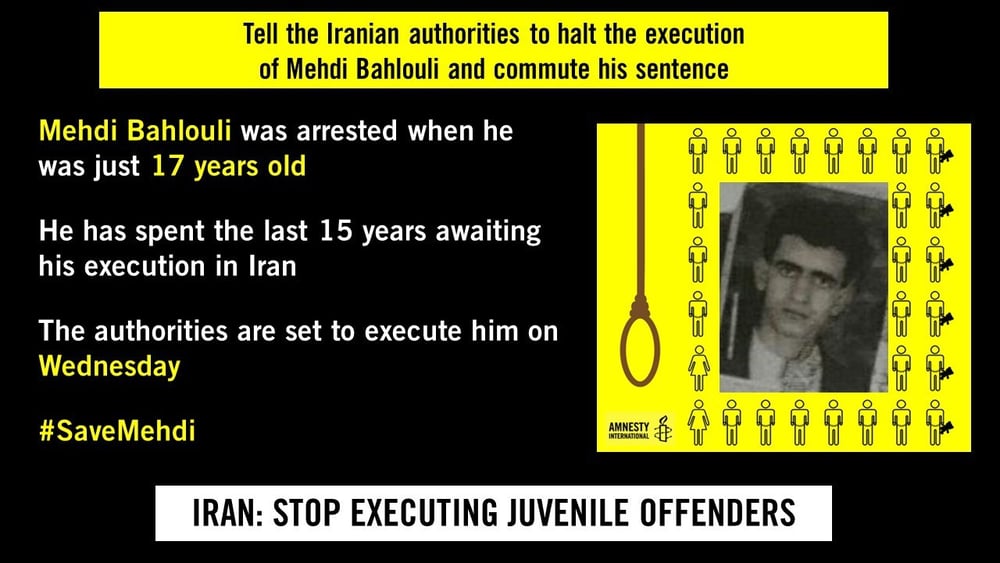 Die iranischen Behörden müssen zwei unmittelbar bevorstehende Hinrichtungen sofort stoppen: Die beiden betroffenen Männer, Mehdi Bahlouli und Peyman Barandah, waren zum Tatzeitpunkt minderjährig.