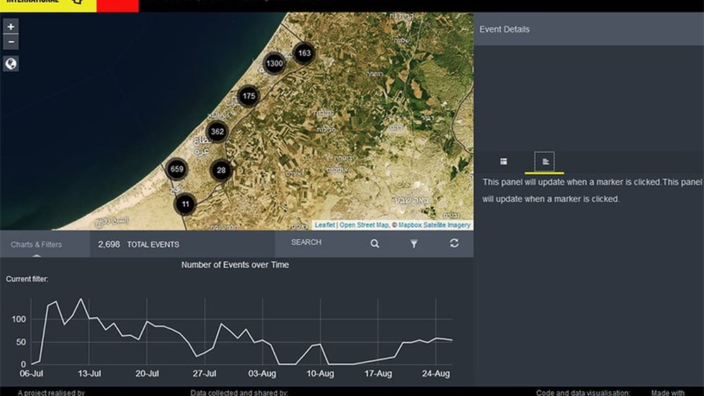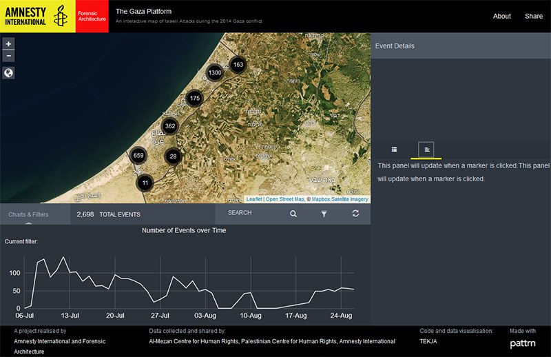 Im Juli / August 2014 kamen in Gaza durch die israelische Operation «Protective Edge» im Juli/August rund 1500 palästinensische Zivilpersonen ums Leben. Zusammen mit der NGO «Forensic Architecture» und den palästinensischen Menschenrechtsorganisationen Al Mezan und PCHR hat Amnesty International die Daten von über 2500 israelischen Luft- und Artillerieangriffen ausgewertet und mit Photos, Videos, Satellitenbildern und ZeugInnenaussagen in der interaktiven Datenbank «Gaza Plattform» auf gazaplatform.amnesty.org umfassend aufbereitet.