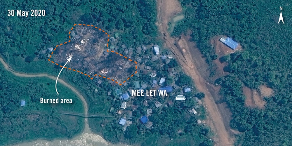 Zudem dokumentierte Amnesty International, wie in verschiedenen Townships der Bundesstaaten Rakhine und Chin Dörfer niedergebrannt bzw. zerstört wurden. Satellitenaufnahmen mehrerer Dörfer zeigen, dass weite Teile in Brand gesteckt wurden – eine übliche Taktik des myanmarischen Militärs. Das Militär und die Arakan Army geben sich gegenseitig die Schuld an den Brandstiftungen.