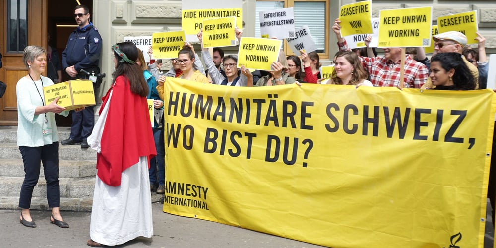 In einer Aktion mit dem Titel «Humanitäre Schweiz, wo bist du?» forderten die Aktivist*innen und eine symbolische verwundete Helvetia die Schweiz auf, sich der humanitären Tradition zu besinnen und sich klar auf die Seite des Völkerrechts zu stellen. Die Forderungen der Petition wurden von 13 weiteren Organisationen unterstützt.