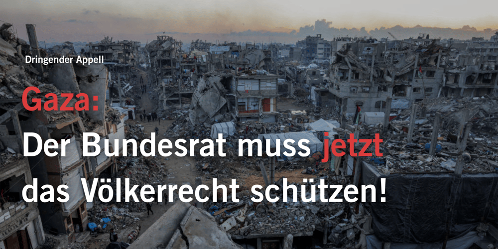 Gemäss Art. 1 der Genfer Konventionen muss die Schweiz alles in ihrer Macht Stehende unternehmen, um Völkerrechtsverstösse zu verhindern. Wir fordern eine Überprüfung der gesamten Nahostpolitik der Schweiz hinsichtlich ihrer menschenrechtlichen und völkerrechtlichen Kohärenz sowie eine öffentliche Rechenschaft über diese Politik. Rund 100 bekannte Persönlichkeiten und Organisationen sind Erstunterzeichnende dieses Appells.