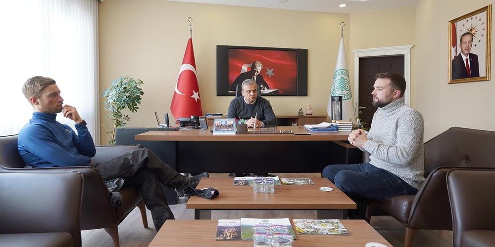 Dort empfängt uns der AKP-Bürgermeister, von dem wir wissen wollen, wer an der Flutkatastrophe schuld war und ob man sie nicht hätte verhindern können. Hinter uns läuft der Fernseher. An der Wand hängt ein Portrait von Recep Tayyip Erdoğan. Für die Übersetzung ist ein Lehrer der lokalen Grundschule zu uns gestossen. Während des Gesprächs macht ein Fotograf Bilder – offenbar soll der Besuch der «Fahrradjournalisten aus der Schweiz» festgehalten werden. Nach vielen nichtssagenden Antworten will uns der Bürgermeister zum Abschied ein Geschenk überreichen und mit uns ein Selfie machen. Das Geschenk können wir höflich ablehnen – in unseren Fahrradtaschen hat es keinen Platz. Das Selfie lassen wir über uns ergehen.