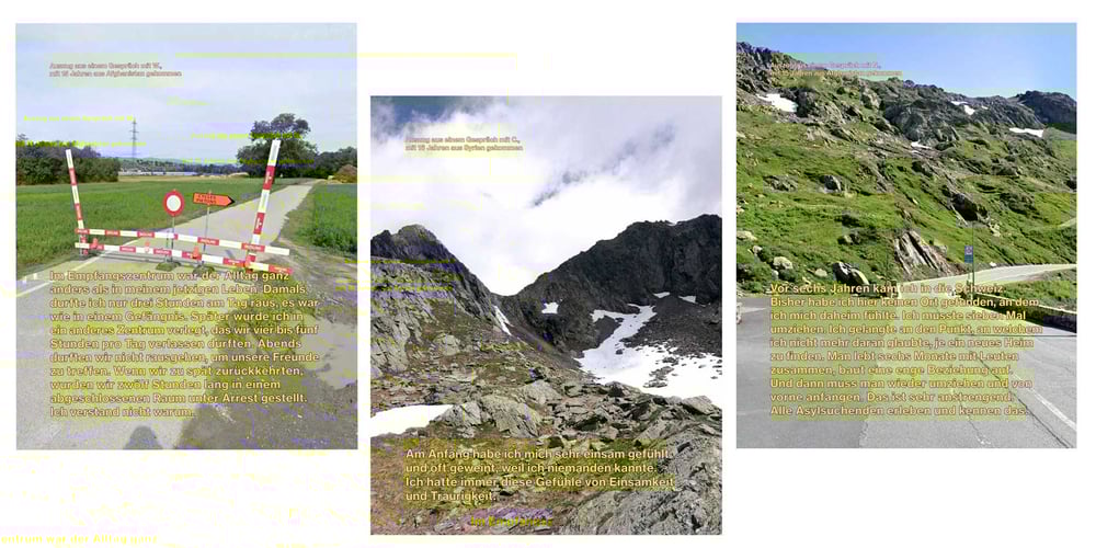 Der Herausforderung, die jungen Zitatgeber*innen selbst nicht zeigen zu können, begegnete die Fotografin Laurence Rasti mit einer Idee: Die Installation besteht aus grossen Stoffplanen, die Landschaftsszenen aus der Schweiz zeigen, wie man sie bei Google Maps anschauen kann. Auf diese wurden die Aussagen von jungen Asylsuchenden gedruckt. Die Poster zeigen also im Grossen das, was im Kleinen auf dem Bildschirm des Mobiltelefons sichtbar ist, das jede Person bei sich hat, die sich auf der Flucht befindet, und mit dem sie sich geografisch zu orientieren versucht.