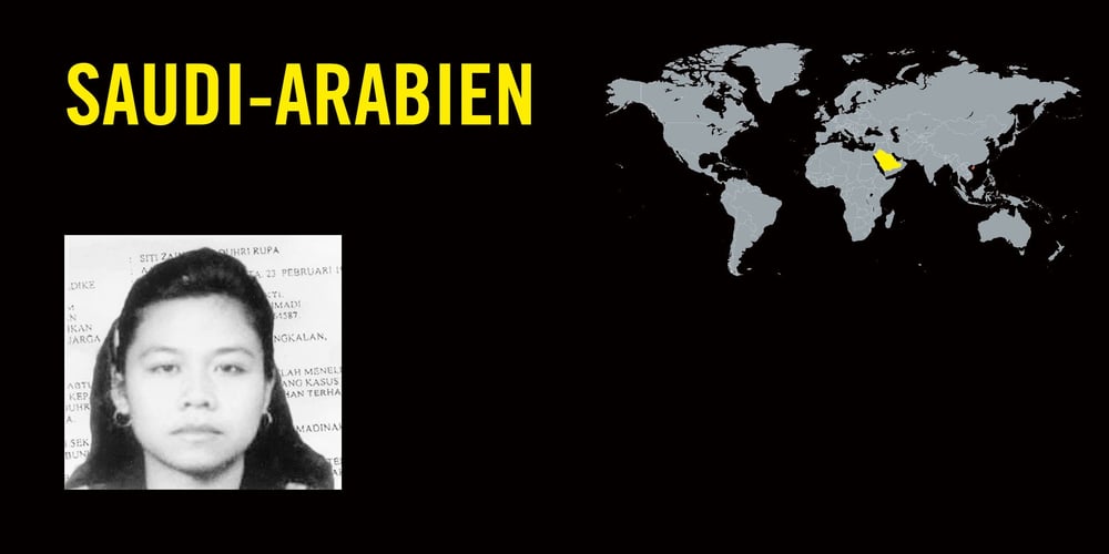 Die Indonesierin Siti Zainab kam im März 1998 nach Saudi-Arabien, um als Hausmädchen zu arbeiten und Geld für ihre Familie und ihre Kinder zu verdienen. Sie hat das Land nie mehr verlassen. Denn bereits im September 1999 wurde sie verhaftet. Sie soll ihre Arbeitgeberin ermordet haben. Nach mehreren Wochen Haft gestand Siti Zainab im Polizeiverhör die Tat. Sie habe ihre Arbeitgeberin getötet, weil sie von dieser und deren Sohn misshandelt worden sei. Das hatte sie bereits früher in Briefen beklagt. Während des Verfahrens erhielt Siti Zainab nie Zugang zu einem Anwalt. In einem unfairen Prozess, der sich einzig auf dieses Geständnis stützte, wurde sie zum Tode verurteilt. Bei den Verhören hatte die Polizei den Eindruck, dass Siti Zainab unter einer psychischen Krankheit litt. Amnesty International forderte die saudi-arabischen Behörden auf, das Todesurteil umzuwandeln, da die Todesstrafe nicht gegen Personen verhängt werden darf, die an einer psychischen Erkrankung leiden. Siti Zeinab wurde am 14. April 2015 in Medina hingerichtet. Die Hinrichtung erfolgte, nachdem die jüngste Tochter von Siti Zainab die Volljährigkeit erreicht hatte.