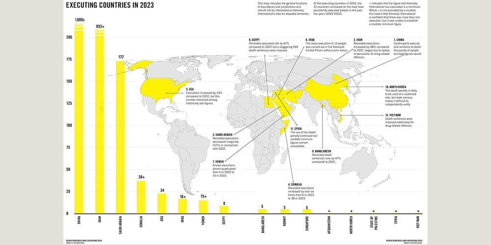 Die fünf Länder mit den meisten Hinrichtungen im Jahr 2023 waren China, Iran, Saudi-Arabien, Somalia und die USA. Auf den Iran allein entfielen 74 Prozent aller registrierten Hinrichtungen, auf Saudi-Arabien 15 Prozent. Somalia und die USA führten im Jahr 2023 eine erhöhte Anzahl von Hinrichtungen durch.