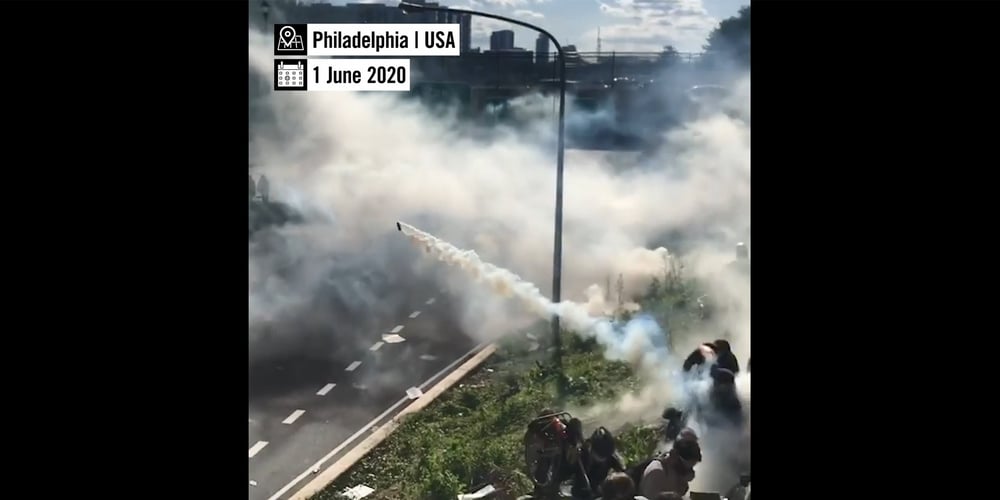 In einem der Videos ist zu sehen, wie die Polizei in der US-amerikanischen Stadt Philadelphia am 1. Juni 2020 wiederholt Tränengassalven auf Dutzende von Demonstrierende abfeuerte, die auf einer steilen Strassenböschung ohne sicheren Fluchtweg eingekesselt waren.
