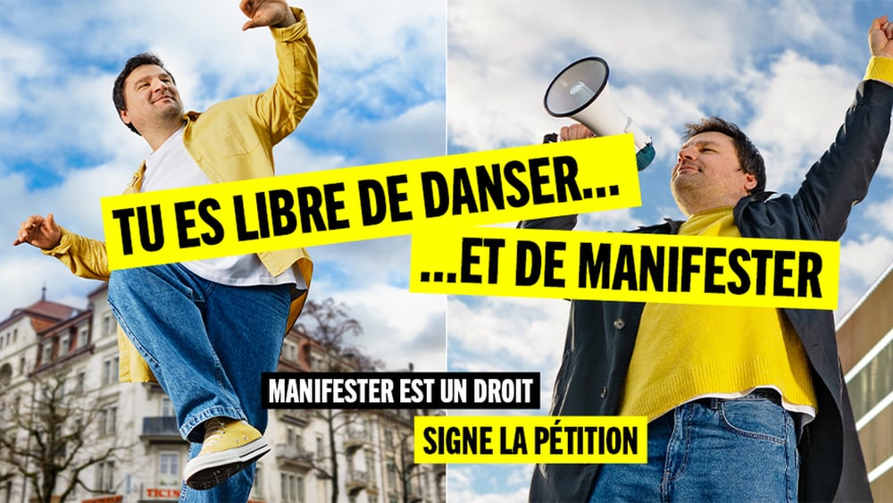 «Tu es libre de danser et de manifester. Manifester est un droit.» C’est avec ce slogan, également décliné en vidéo, qu’Amnesty International lançait la seconde phase de sa campagne en faveur du droit de manifester en Suisse qui a débuté au printemps 2025. L’organisation a également lancé une pétition qui demande aux autorités de reconnaître la légitimité des manifestations pacifiques, d’en simplifier la tenue avec des processus simples et gratuits, et de veiller à ce que la police rende des comptes lorsqu’elle commet des violations à l’encontre de manifestant·e·x·s.